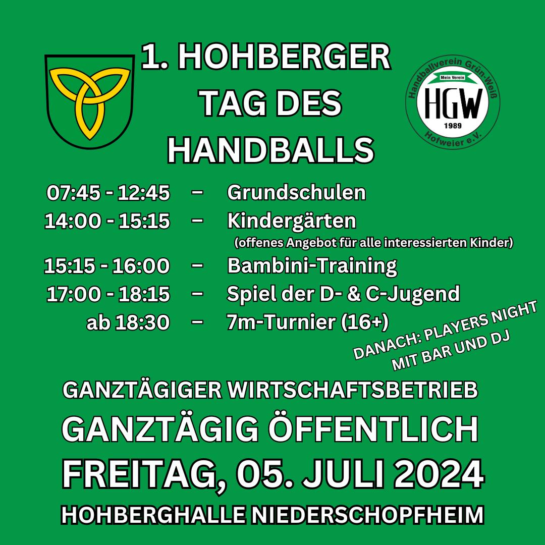 Am Freitag, 05. Juli 2024 feiert der HGW Hofweier in der Hohberghalle Niederschopfheim zum ersten Mal den „Hohberger Tag des Handballs”. Dabei kooperiert der Traditionsverein mit dem Handballverband Baden-Württemberg, der Gemeinde Hohberg, der Gemeinschaftsschule Hohberg, der Grundschule Niederschopfheim und allen Hohberger Kindergärten.