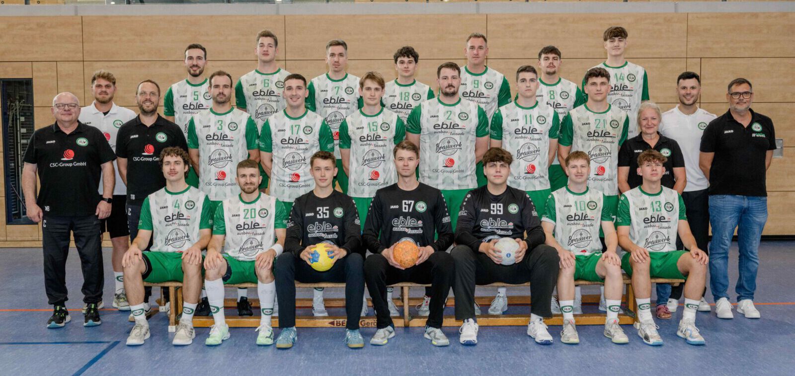 Mitte von links: Co-Trainer Marco Barbon, Mannschaftsverantwortlicher Luca Barbon, Trainer Tobias Buchholz, Jochen Remmel, Mathis Isenmann, Jan Ehleiter, Eike Neff, Tom Kühne, Luca Hackhofer, Physio Daniela Hesse, Athletiktrainer Noel Levefre, Vorstand Alex Brüderle